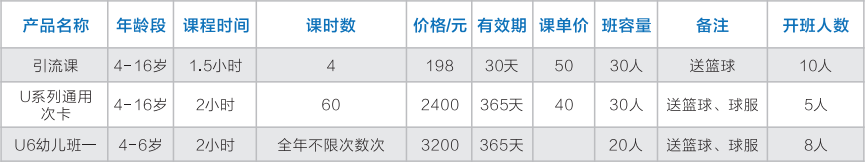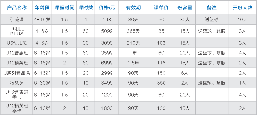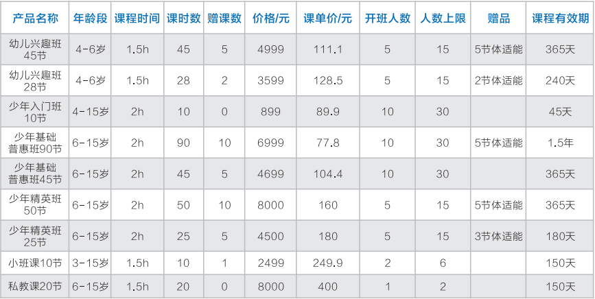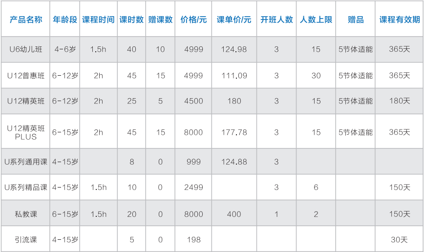 華艦動體體教融合項目組各場館共有U系列普惠班、精英班、私教課、引流課產品、散客卡、包場金卡、銀卡產品。開設培訓班有私教一對一、一對二、一對三定制教學班及暑期培訓班,長訓班招生年齡為4-18周歲。暑期培訓班每年只在7月份、8月份開展培訓,培訓價格為普惠班 1500 元/期,課單價 100 元 ;暑期精英班 1800 元/期,課單價 120 元。